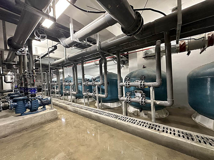 兩款泳池設備構成的泳池循環過濾系統,全面濾除泳池水中的各類沉淀物和雜質,使得泳池水質達標,保證游泳者的健康。