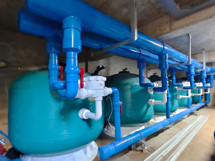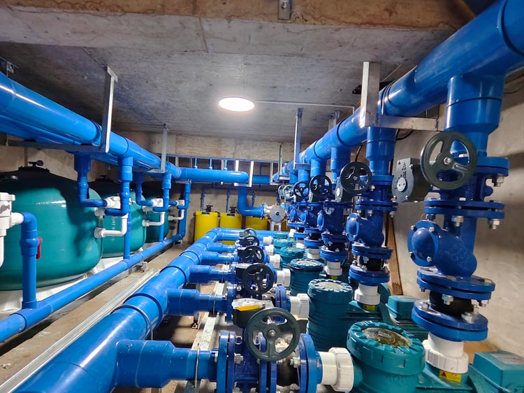 走進海口某高端小區會所泳池,AQUA愛克的系列泳池設備——包括泳池水泵、過濾砂缸、中壓紫外線殺菌器、水質監控儀和投藥泵等,正協同運轉,默默守護著水質潔凈與安全。