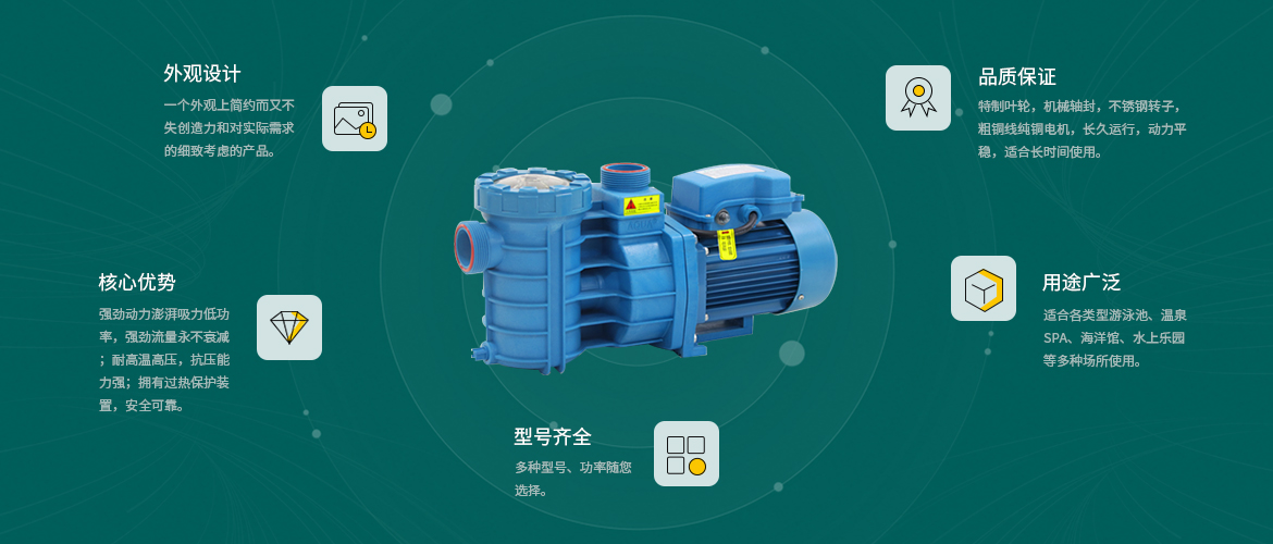 AQUA愛克泳池設備旗下的泳池循環水泵水泵適用于70℃的溫泉,承壓可達6kg/cm2,是適合各類型游泳池、溫泉SPA、海洋館等多種場所使用的水泵泳池設備。