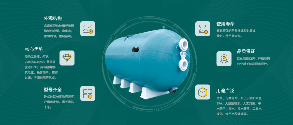 AQUA愛克泳池設備旗下的臥式過濾砂缸采用優質的玻璃纖維樹脂制作成型,密度高,厚薄均勻,纏繞緊密