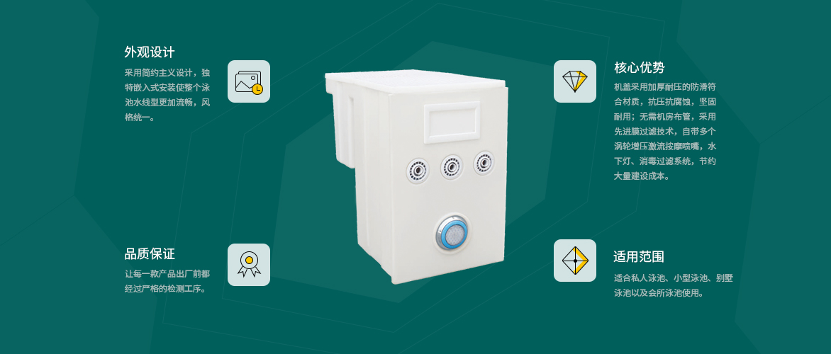 AQUA愛克泳池設(shè)備旗下的嵌入式一體機A-09,嵌入式安裝與泳池結(jié)構(gòu)完全獨立,顛覆傳統(tǒng)的思維,與環(huán)境融洽“相處”。