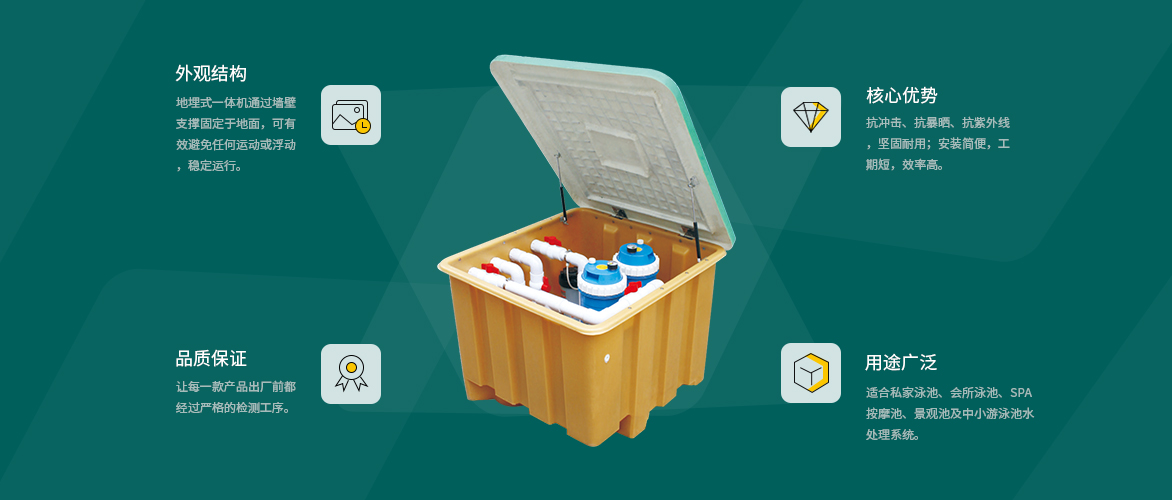AQUA愛克泳池設(shè)備旗下的地埋式一體機(jī)殼體采用特殊材質(zhì),抗沖擊、抗暴曬、抗紫外線,堅固耐用。