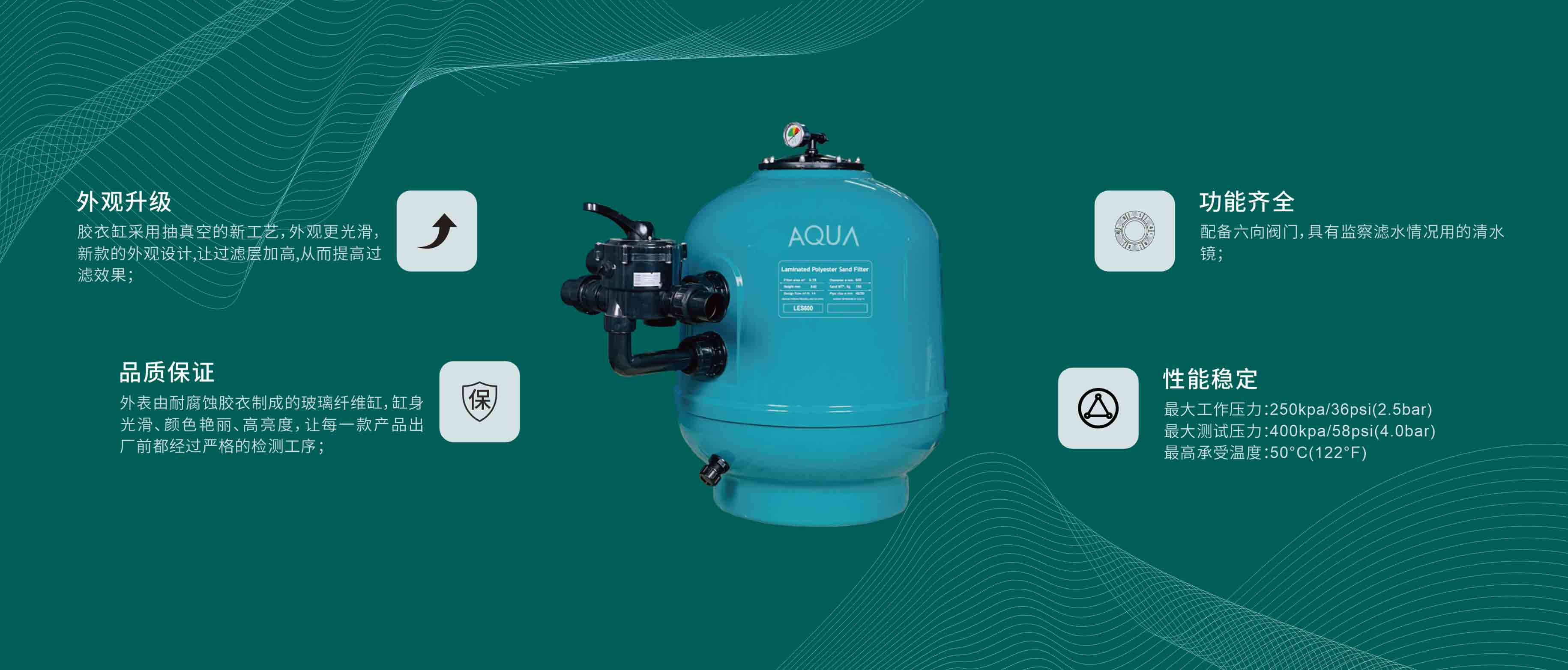 -膠衣缸采用抽真空的新工藝,外觀更光滑; -新款的外觀設計,讓過濾層加高,從而提高過濾效果; -外表由耐腐蝕膠衣制成的玻璃纖維缸; -缸身光滑、顏色艷麗、高亮度; -配備六向閥門; -具有監察濾水情況用的清水鏡; -維護方便,易清潔。
