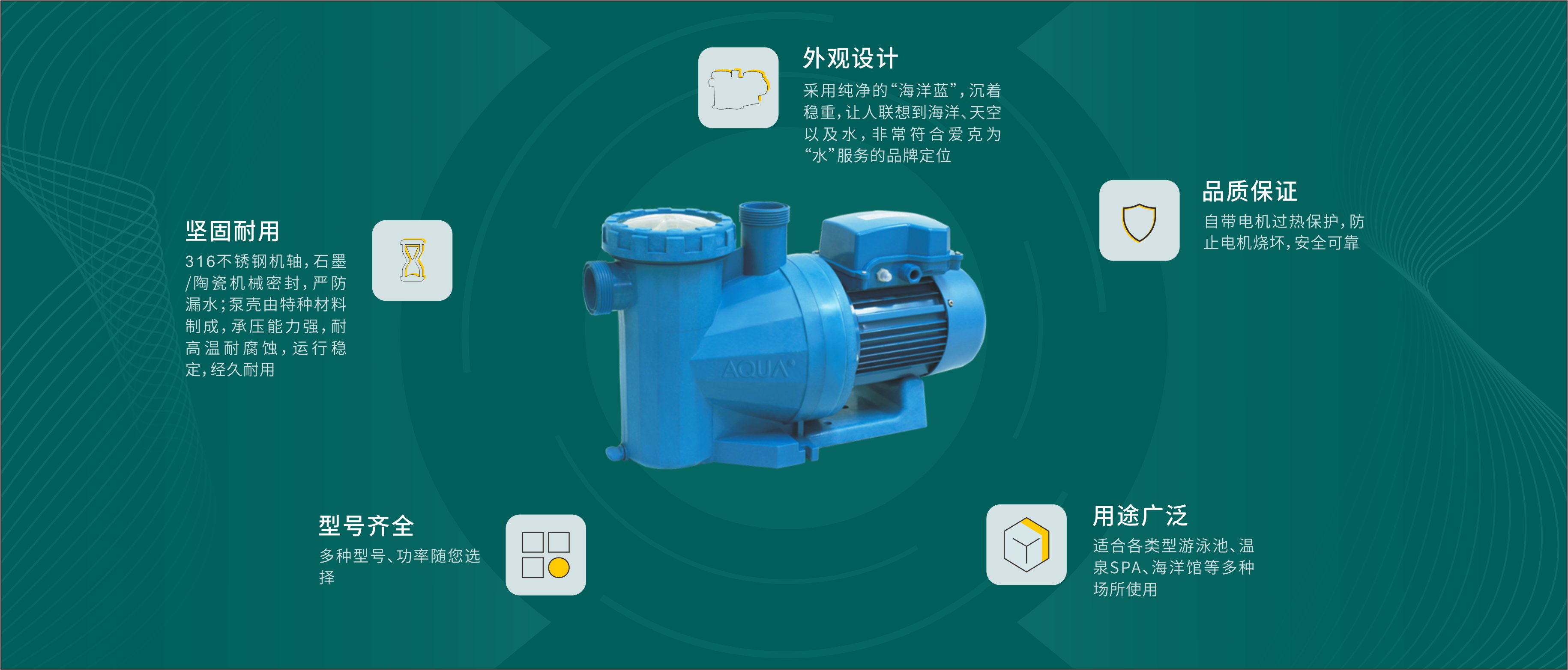 AQUA愛克泳池設備旗下的泳池循環水泵水泵適用于70℃的溫泉,承壓可達6kg/cm2,是適合各類型游泳池、溫泉SPA、海洋館等多種場所使用的水泵泳池設備。