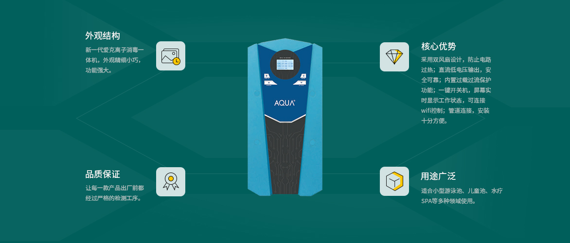 外觀時尚;立體式設計,占地面積小,節(jié)省空間,安裝簡易,AQUA愛克泳池消毒設備是游泳池、景觀池、海洋館、凈水處理、水產(chǎn)養(yǎng)殖、廢水處理、車間消毒等項目的理想選擇。