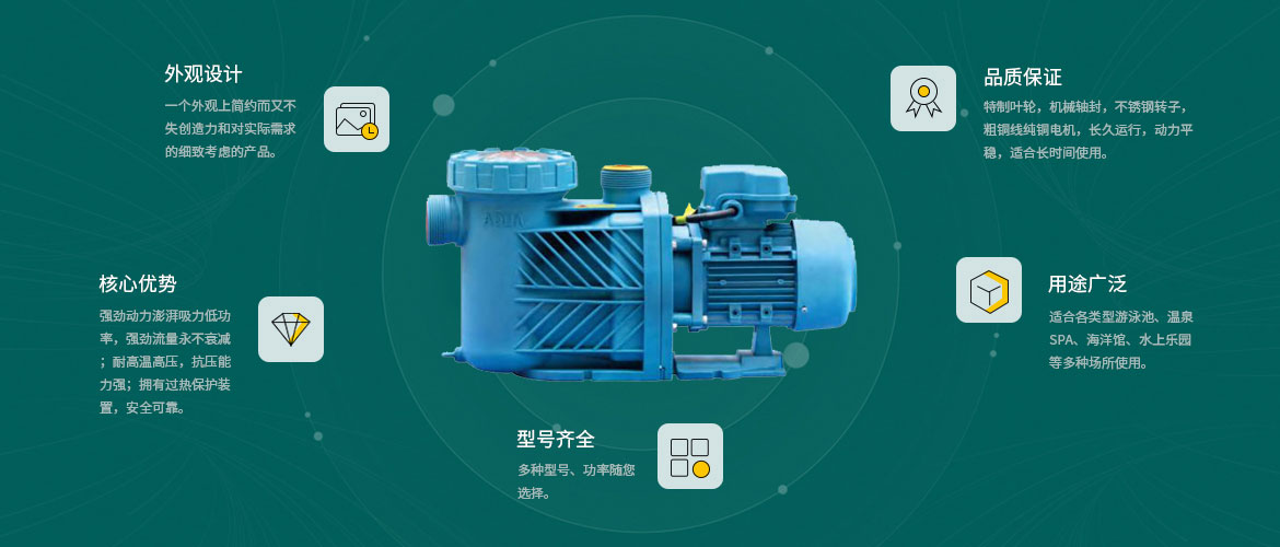 AQUA愛克泳池設備旗下的泳池循環水泵水泵適用于70℃的溫泉,承壓可達6kg/cm2,是適合各類型游泳池、溫泉SPA、海洋館等多種場所使用的水泵泳池設備。