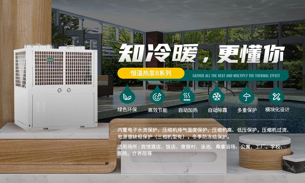 Air source heat pump外觀優雅、大氣,抗老化、耐腐蝕。全天候可靠工作。空氣源熱泵是一種從低溫熱源吸取熱量,使其在較高溫度下轉換為可利用能源的高效率的環保節能型產品。AQUA愛克空氣源恒溫熱泵分為常溫和低溫兩種不同型號。