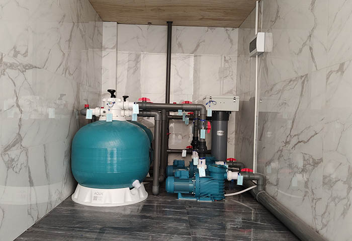 據悉,該泳池的循環過濾消毒系統主要由知名泳池設備品牌AQUA愛克提供。具體由AQUA愛克泳池水泵、泳池過濾砂缸、汞齊紫外線殺菌器三款泳池設備構成,幫助業主實現泳池泳池水處理、循環過濾、消毒殺菌目的