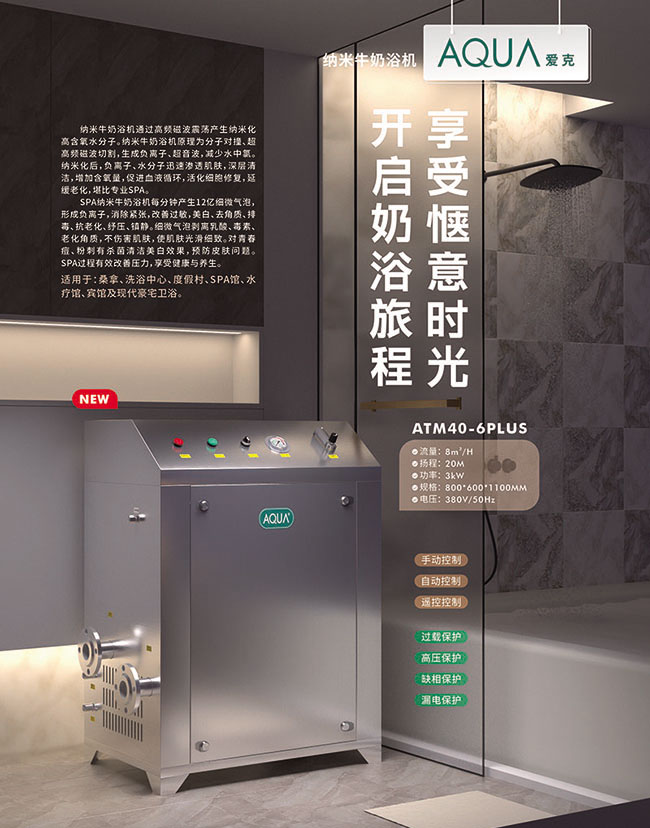 AQUA 愛克納米牛奶浴機工作原理神奇而高效,通過高頻磁波震蕩產生納米化高含氧水分子。納米化后的負離子、水分子如同獲得了 “加速通行證”,可迅速滲透肌膚,實現深層清潔,為肌膚注入充足氧氣,促進血液循環,喚醒細胞活力,修復受損細胞,延緩衰老進程,讓您從內而外散發年輕活力,盡享品質生活。選擇 AQUA 愛克納米牛奶浴機,就是選擇一種健康、純凈、水潤的生活方式,開啟您的專屬 SPA 之旅,擁抱生活的每一刻美好。